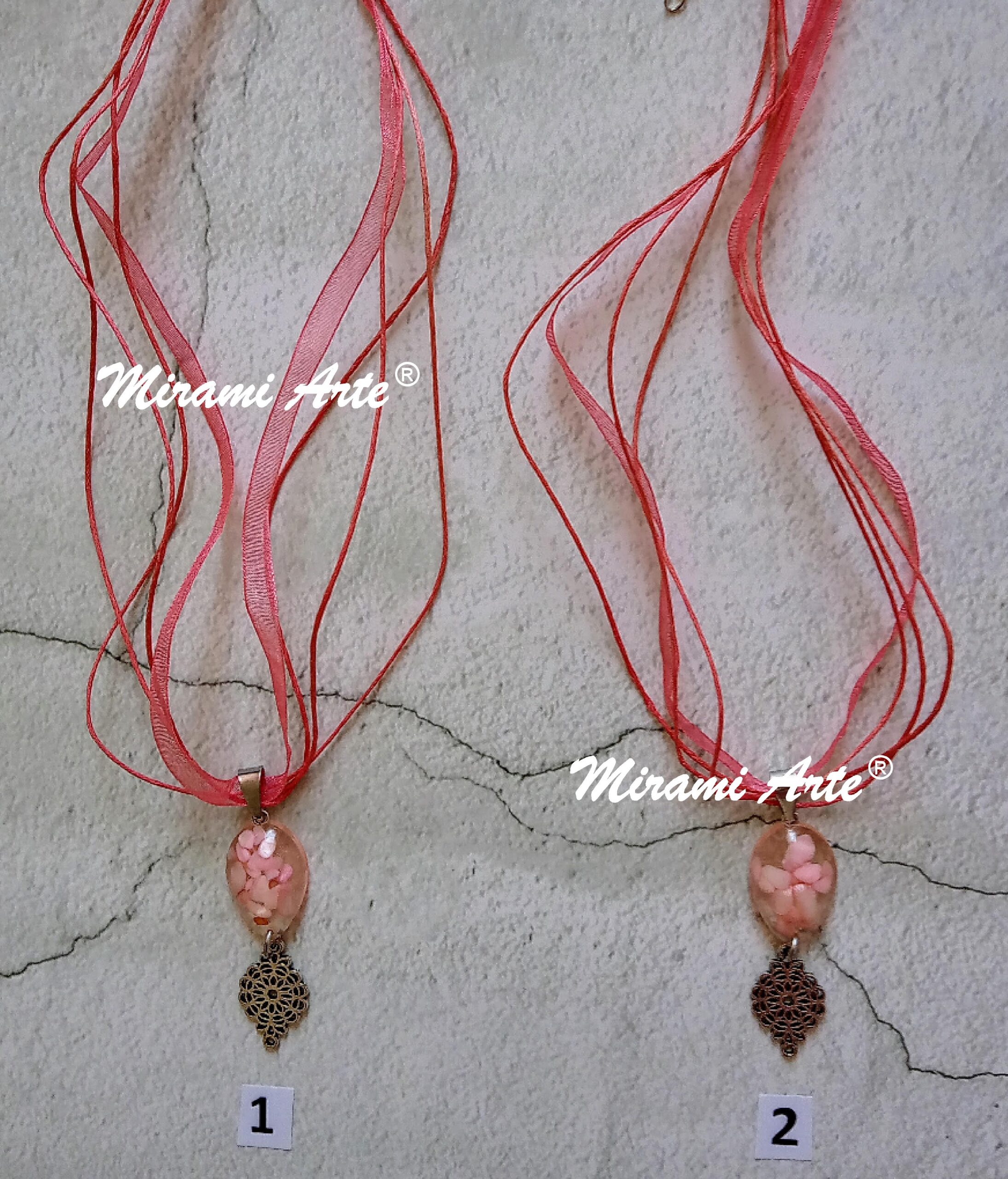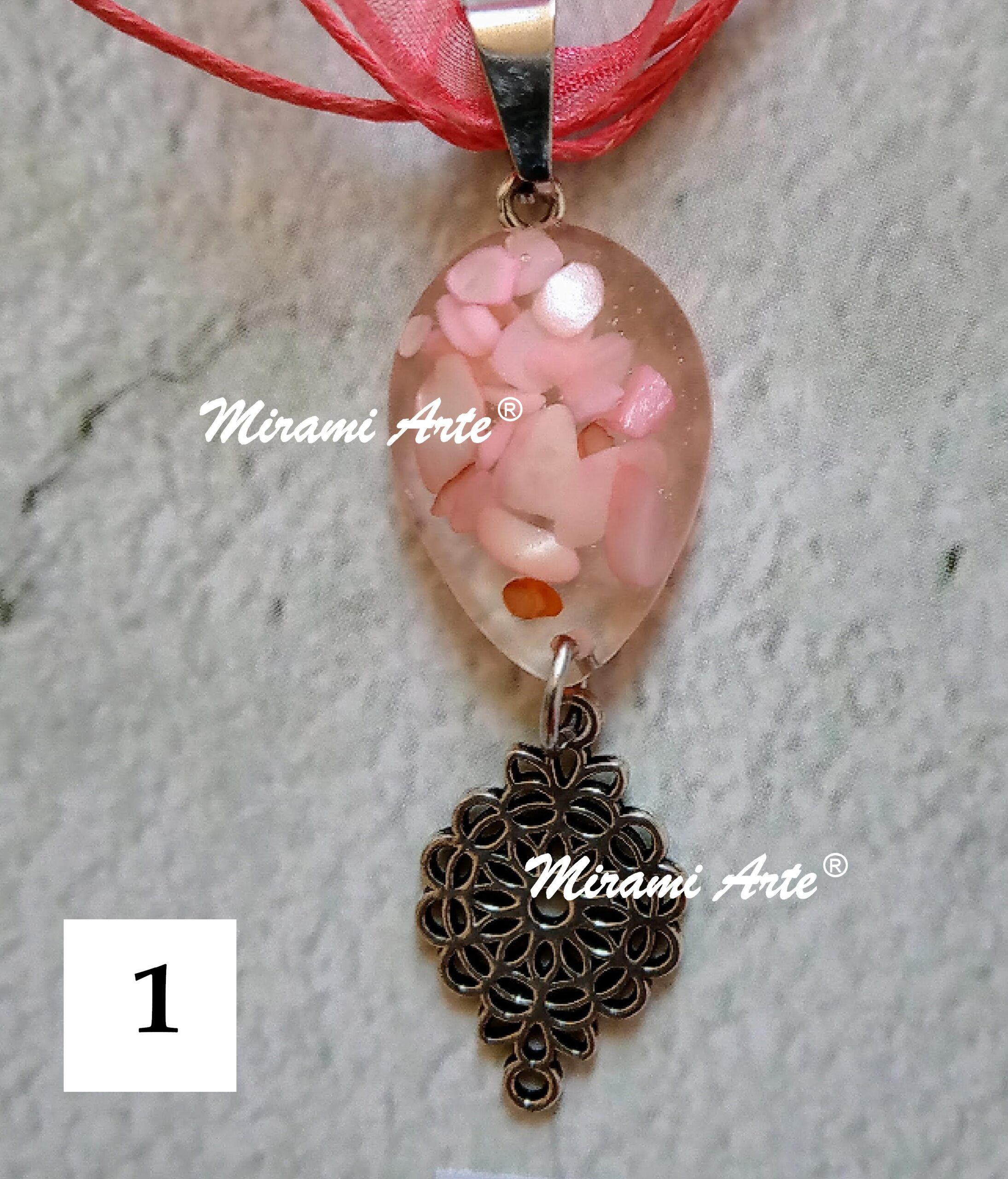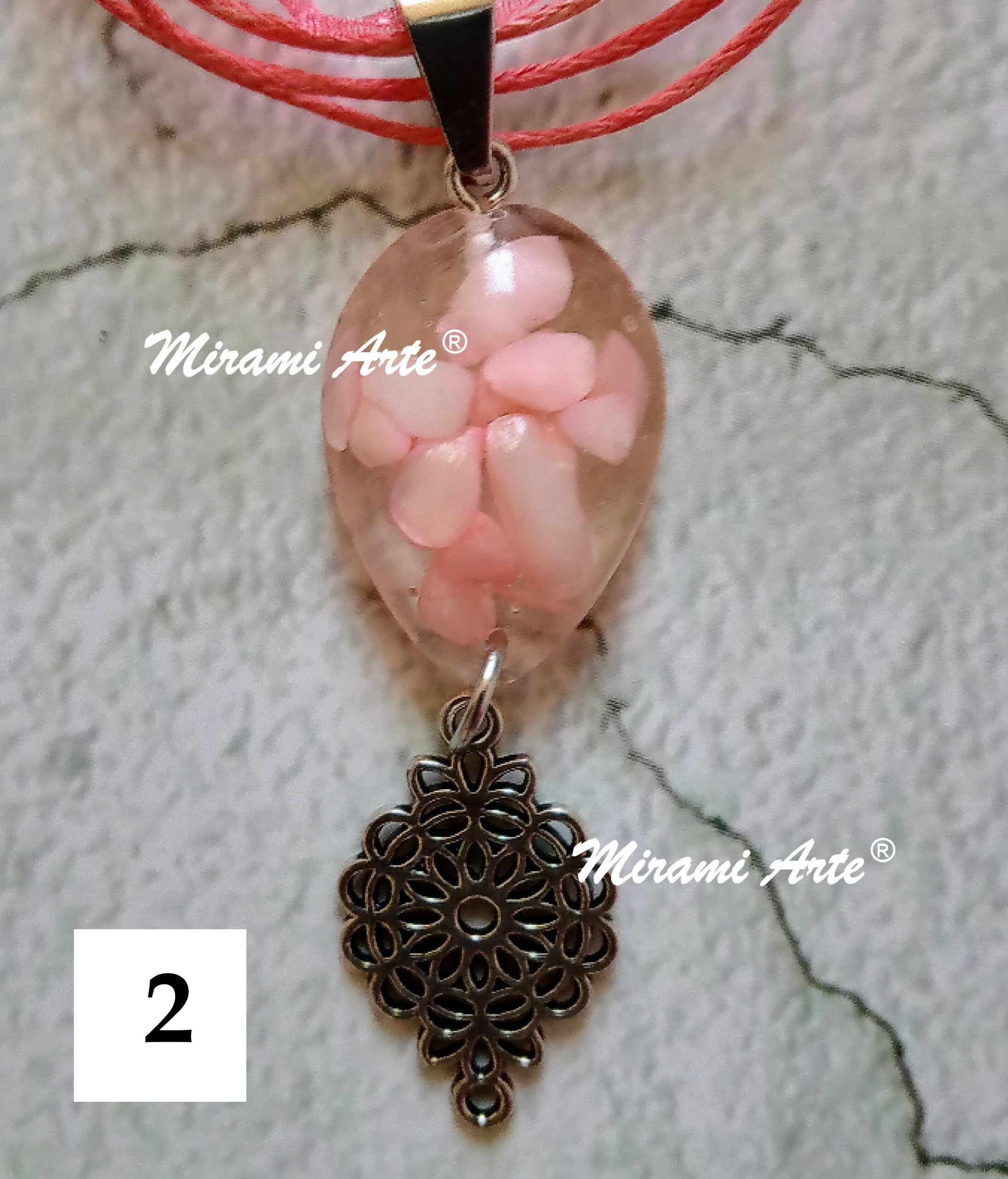 Colgante en resina transparente con piedras naturales en rosa + una aplicación en acero.