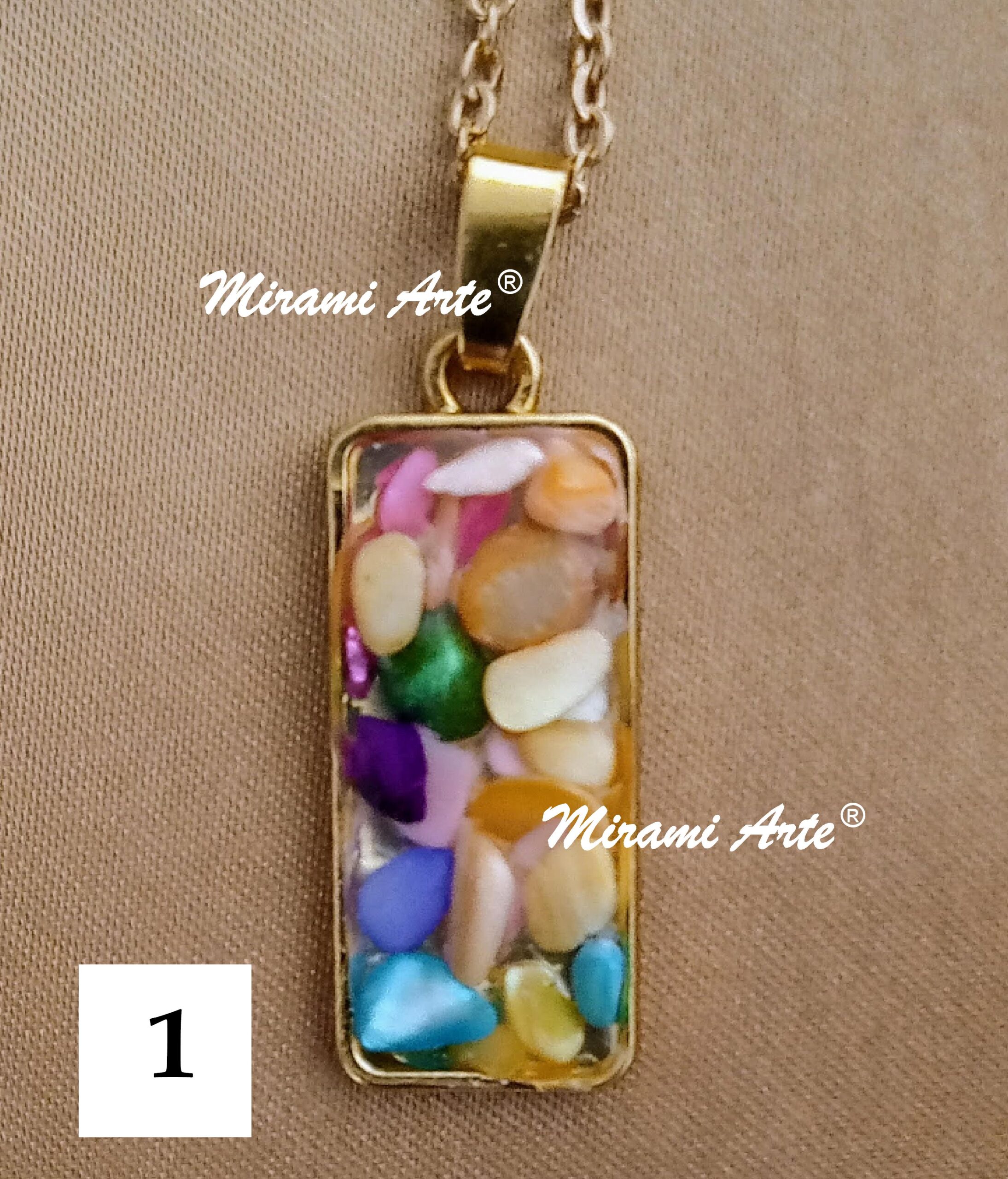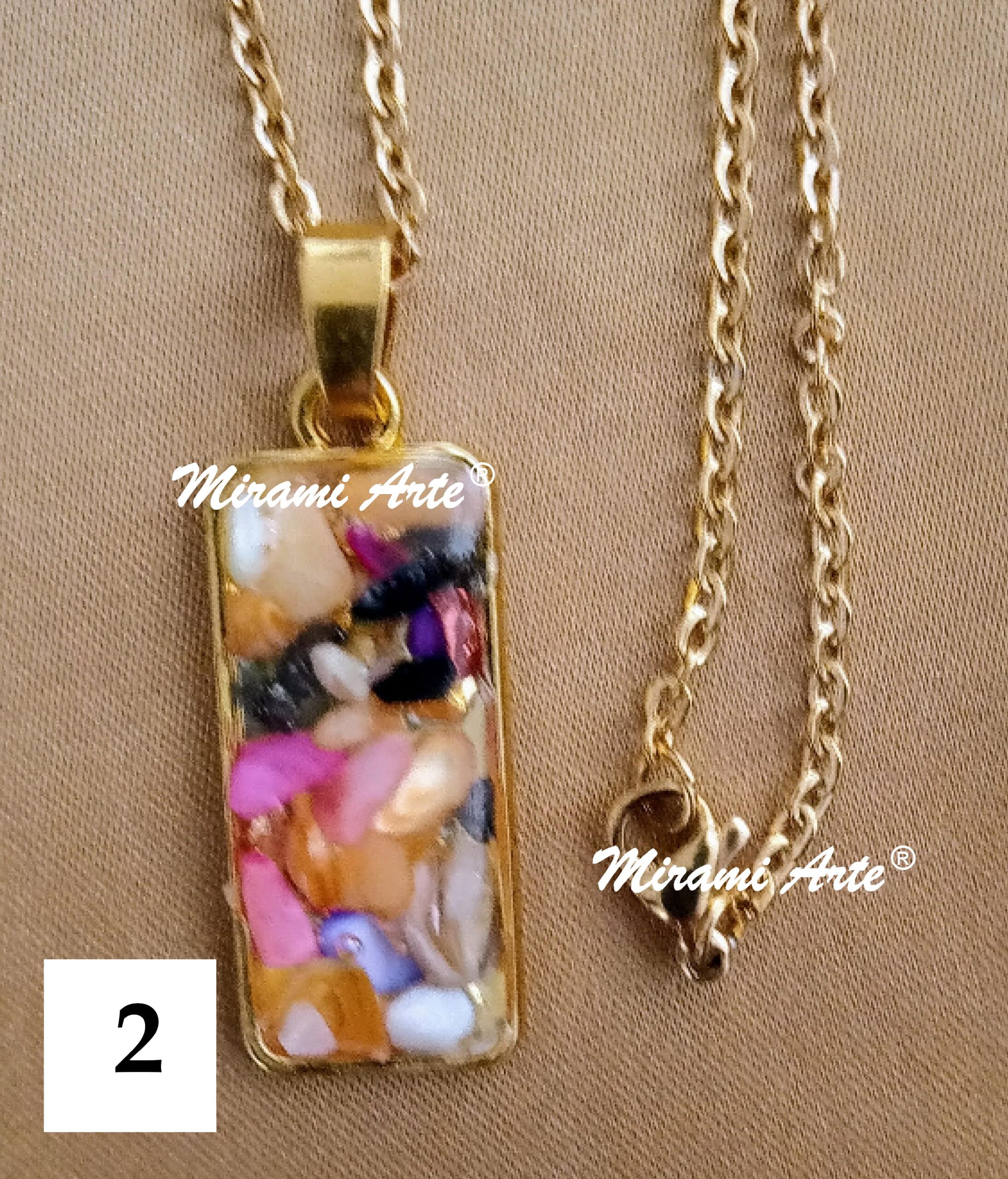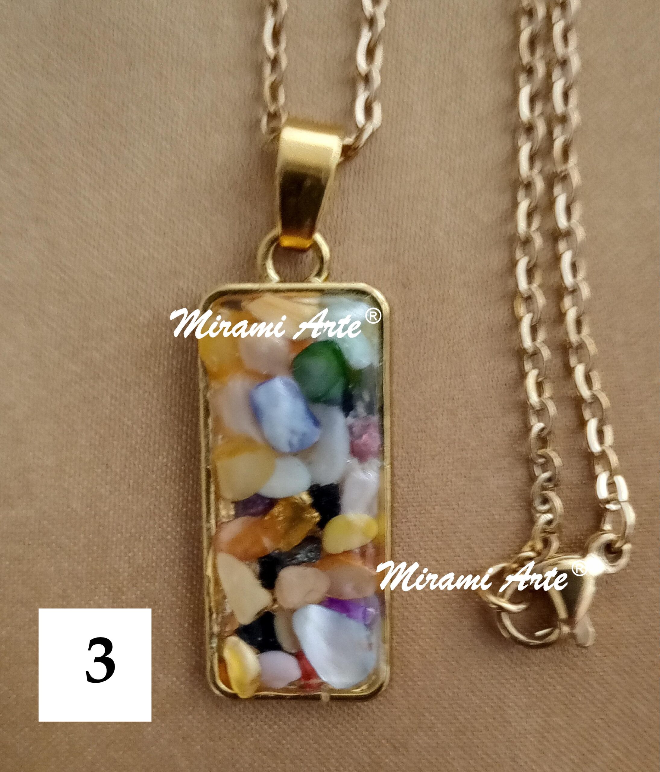 Elegantes colgantes con piedras decorativas en resina,diferentes colores en base metálica dorada 2.5 x 1 cms. Cadena dorada 40 cms