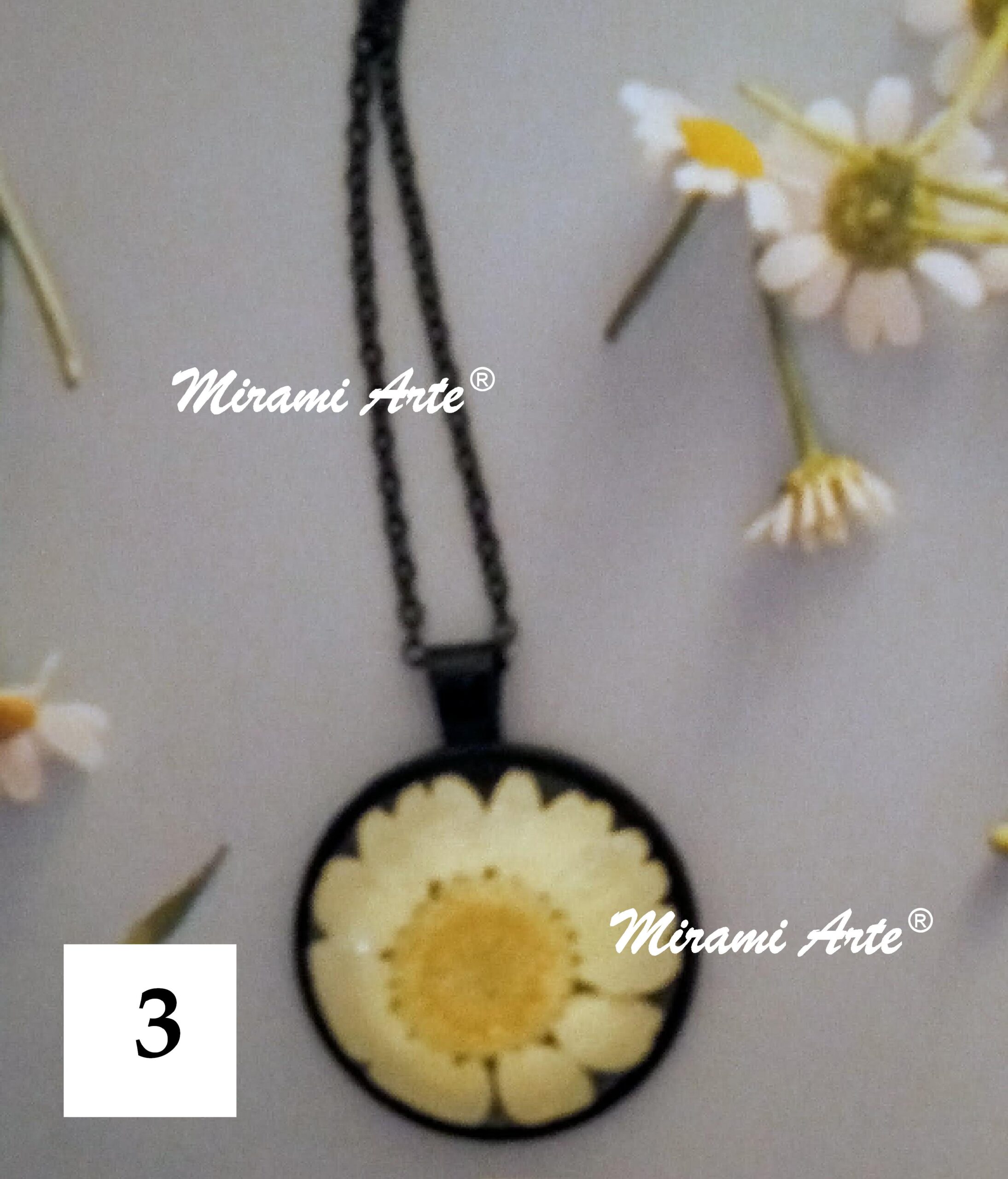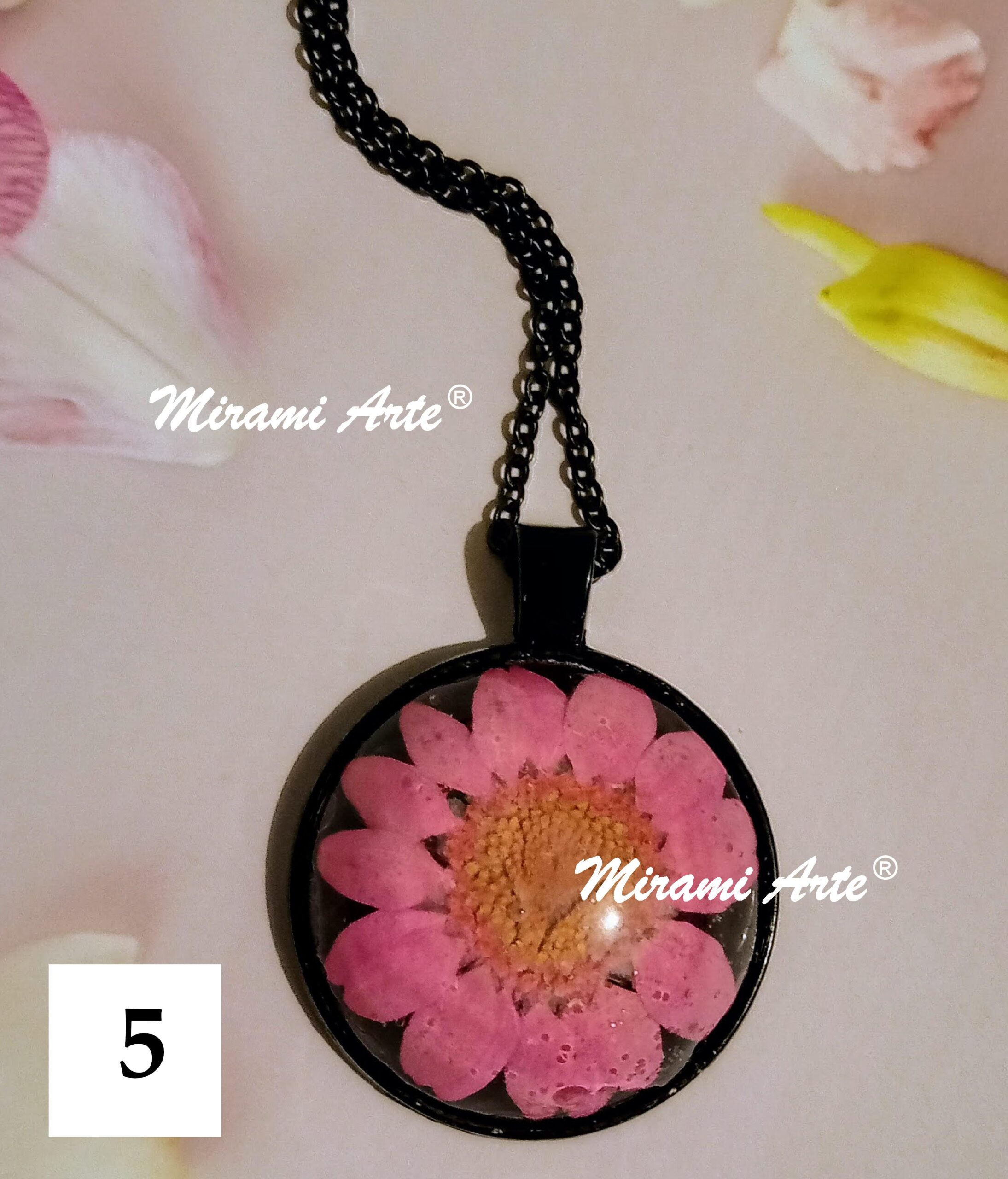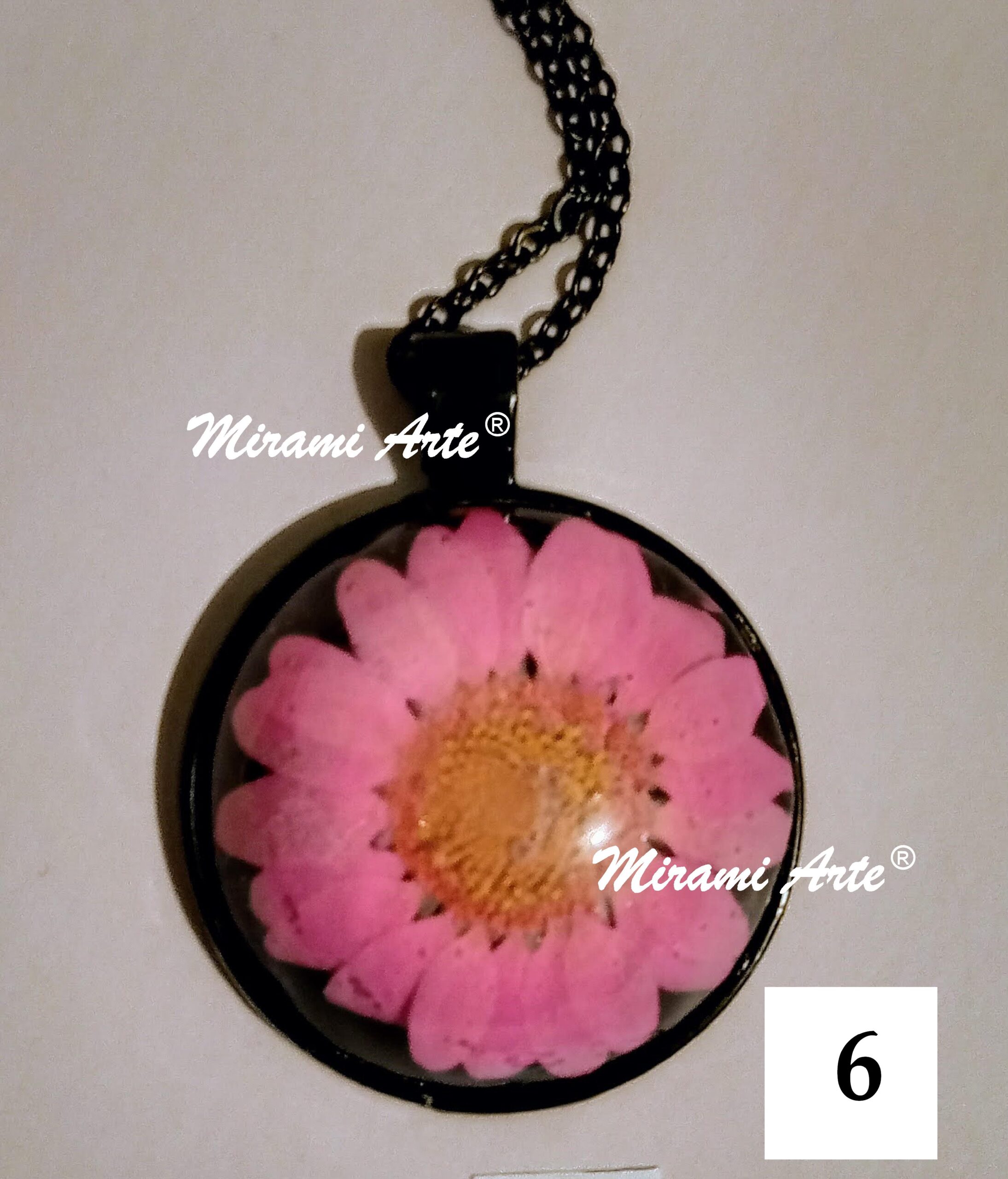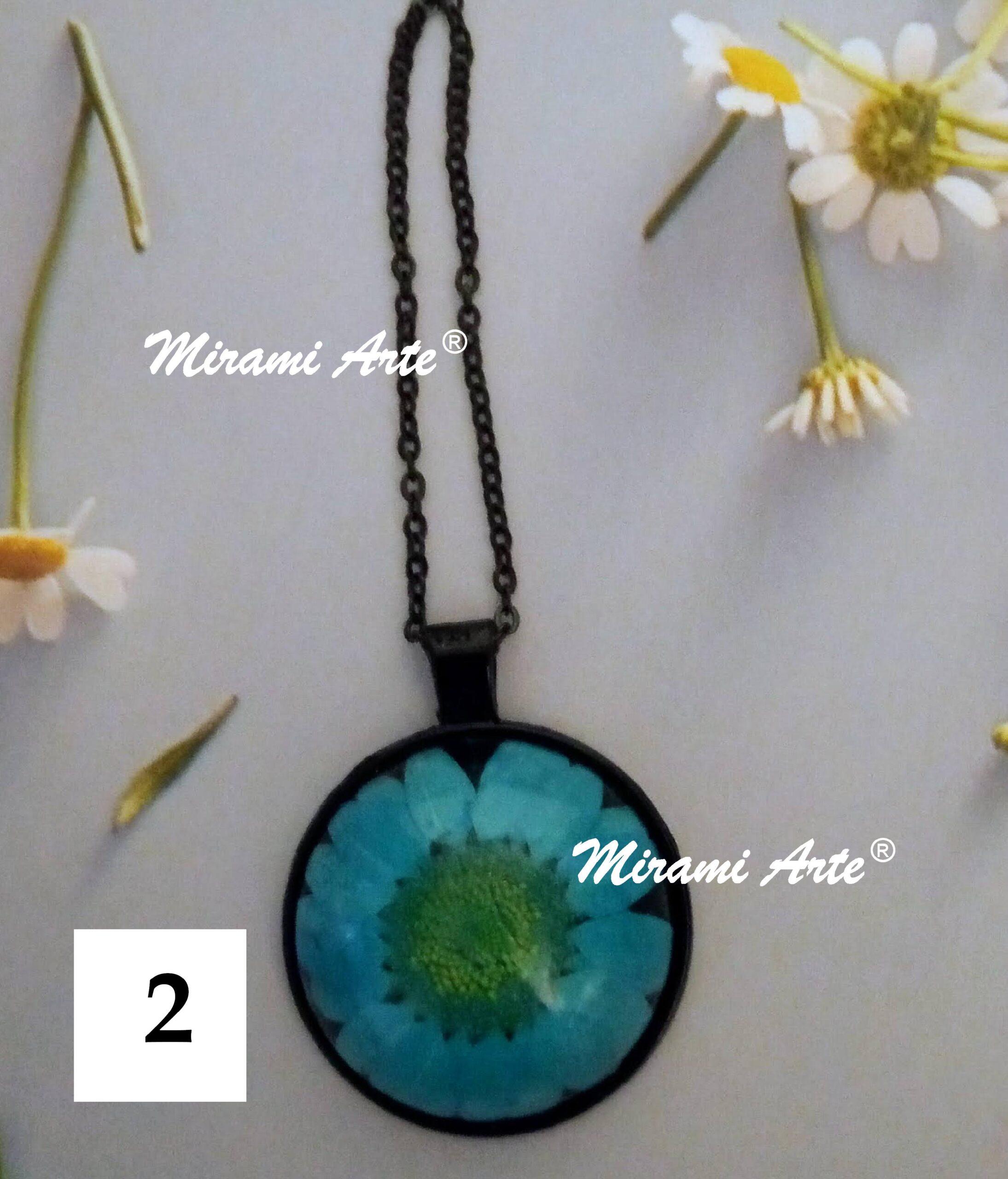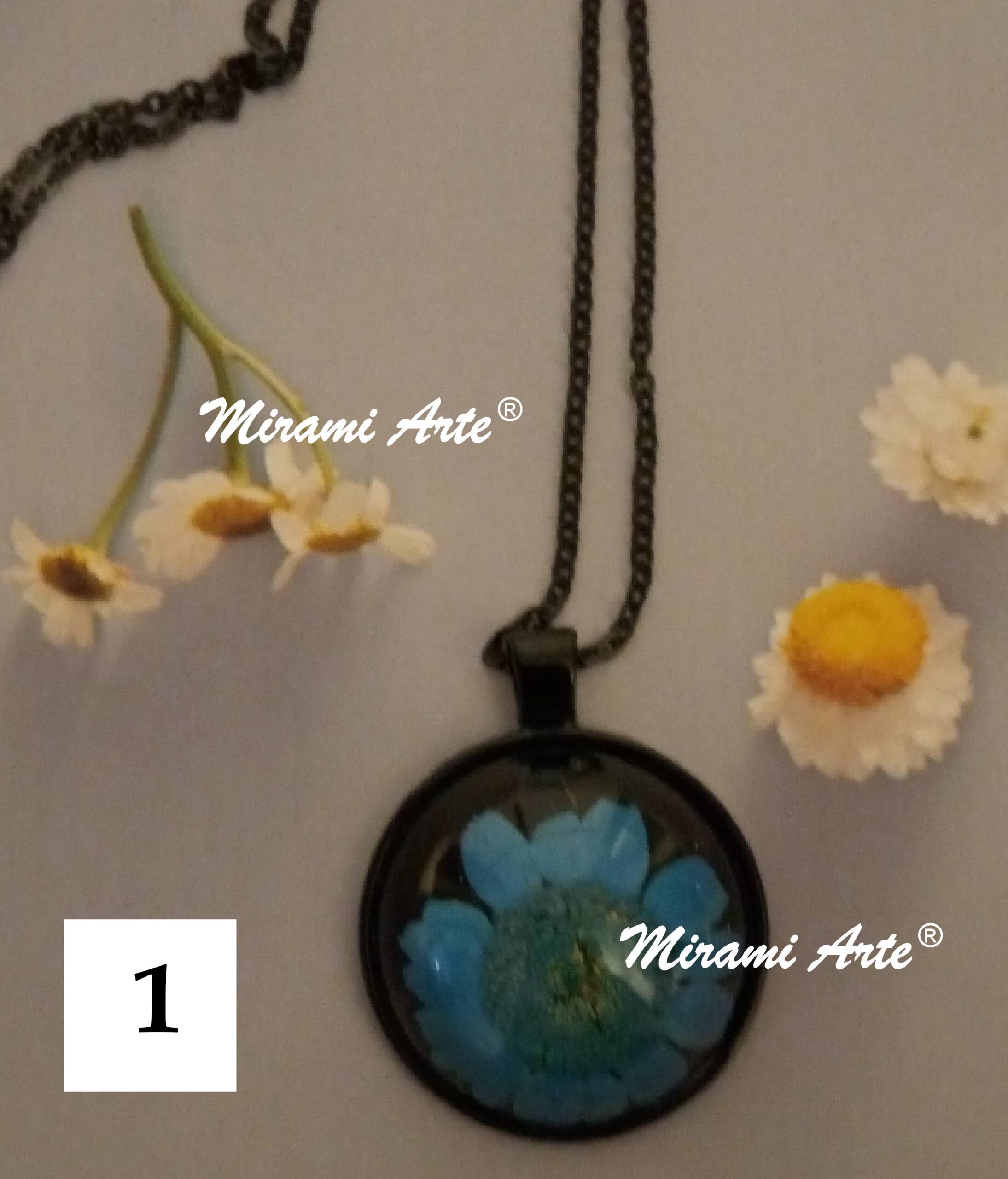 Colgantes con única flor natural azul, blanca y rosada en resina con cadena fantasía 50 cms al tono y también con base redonda metálica negra 3 cms.