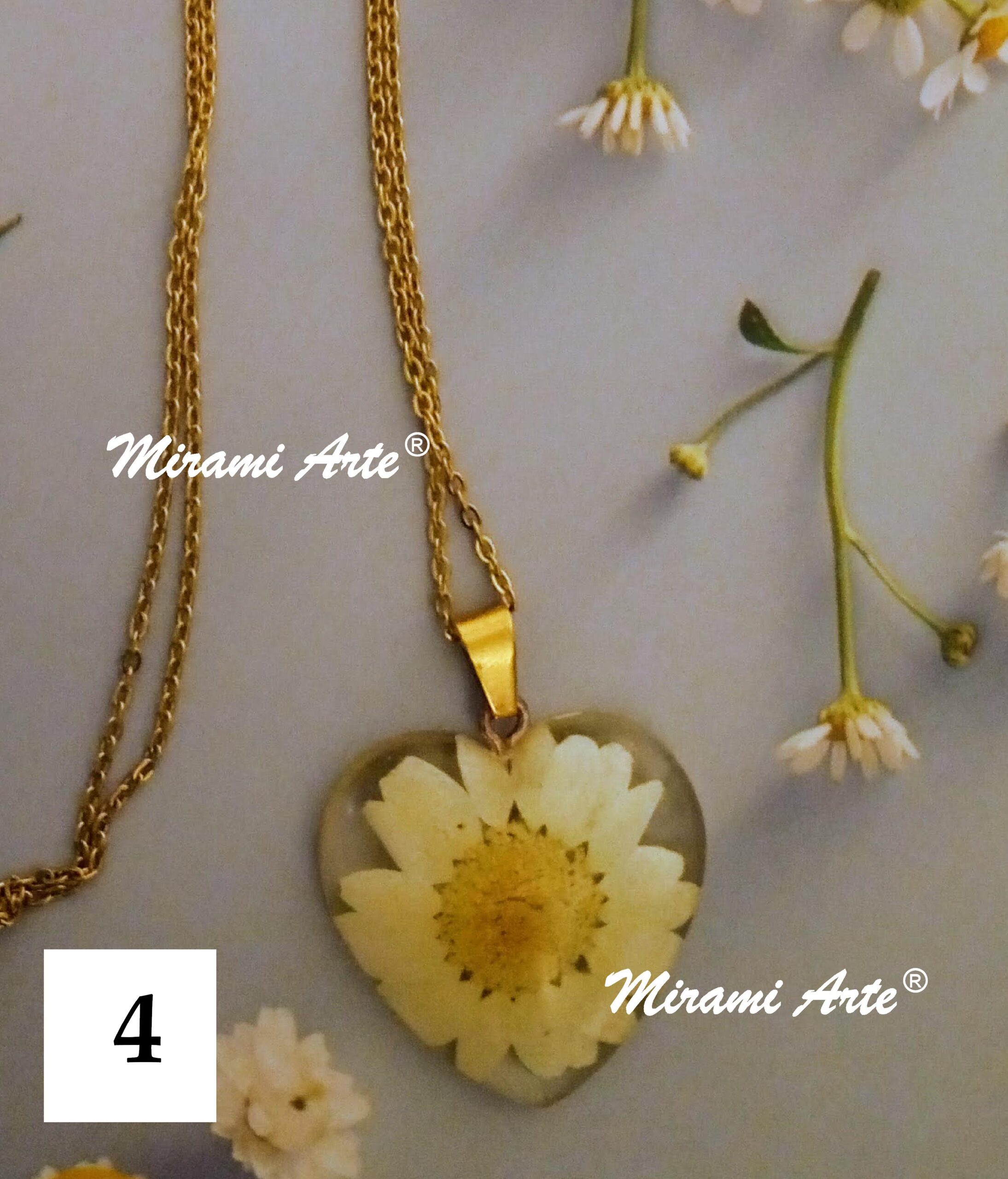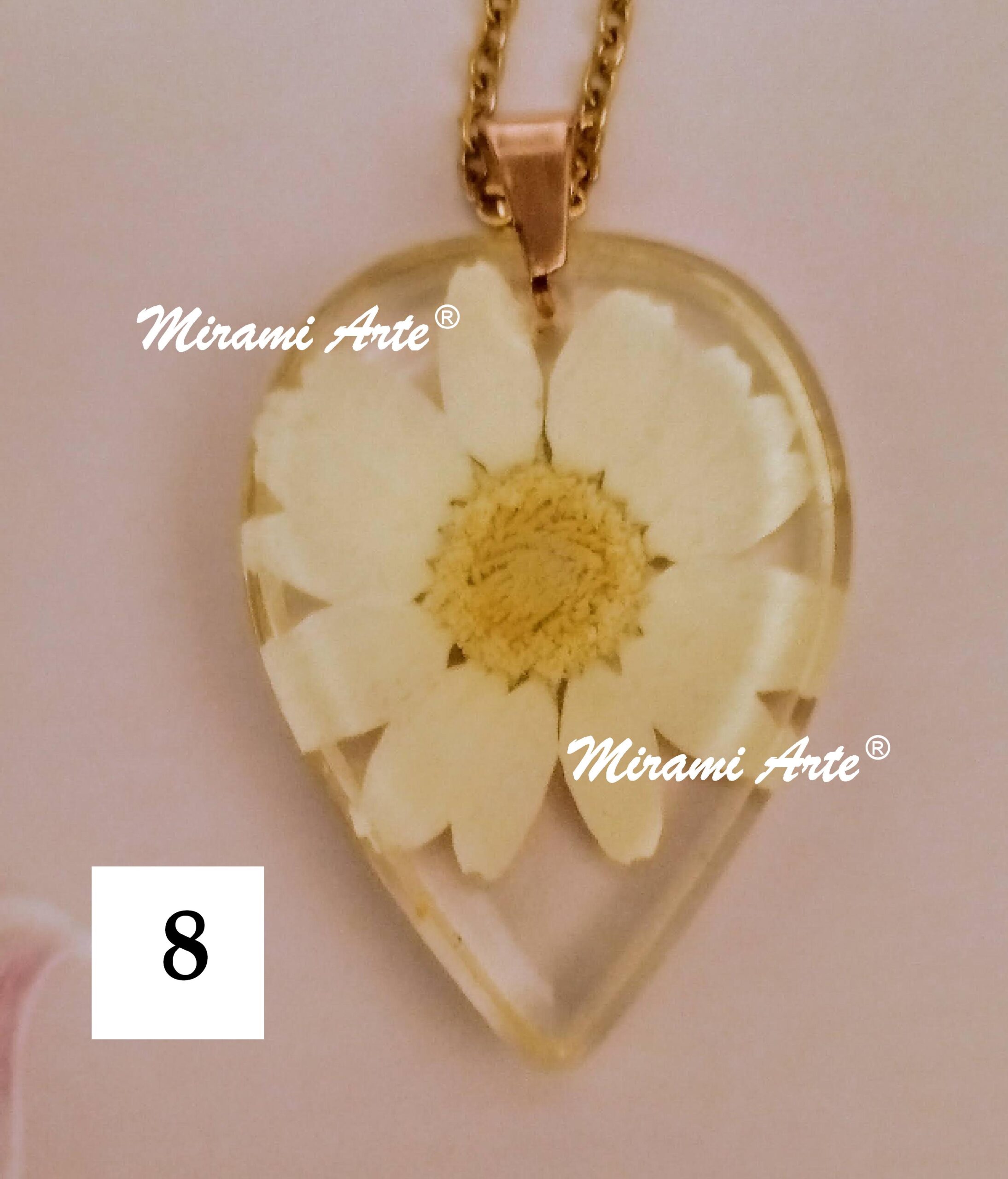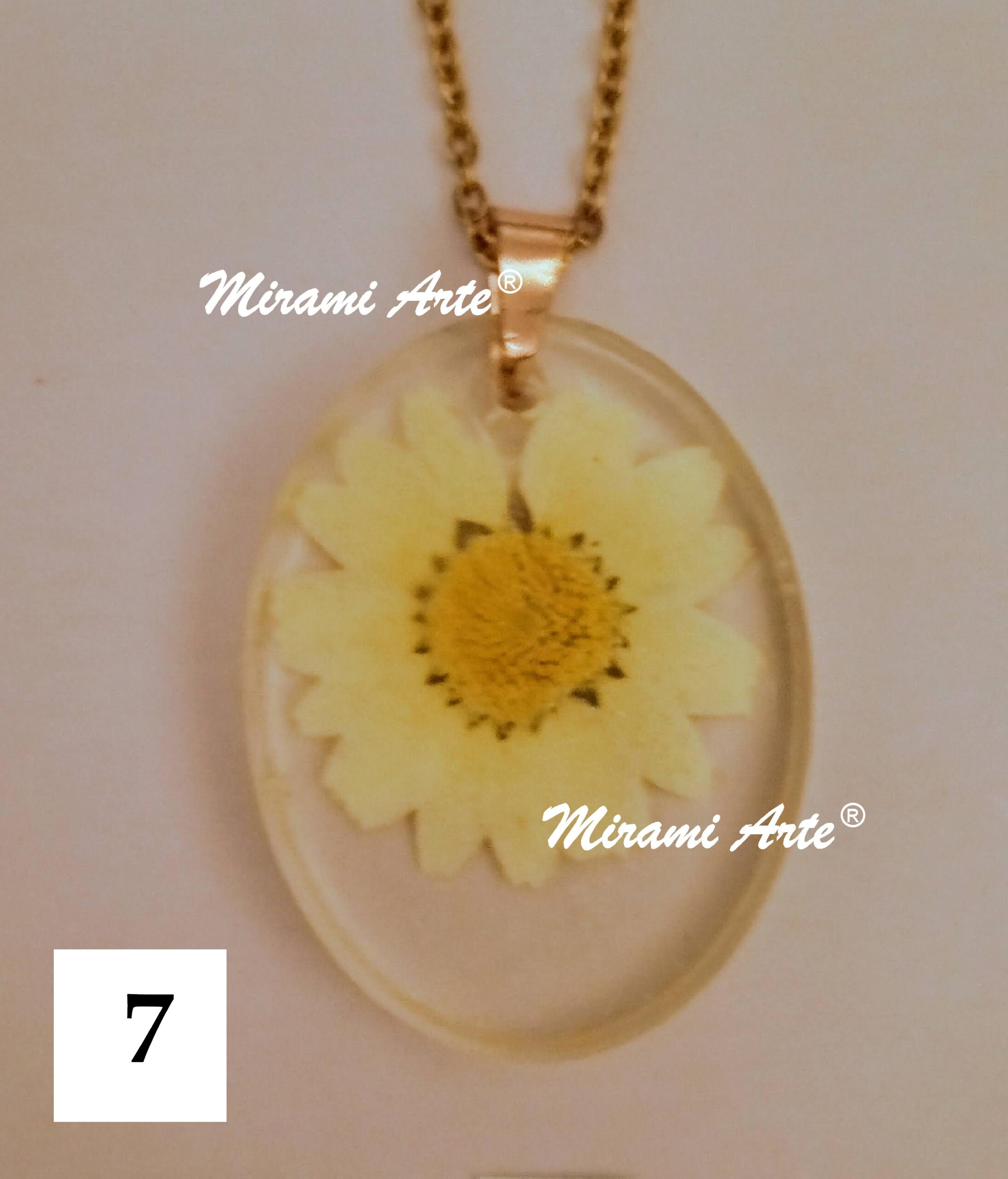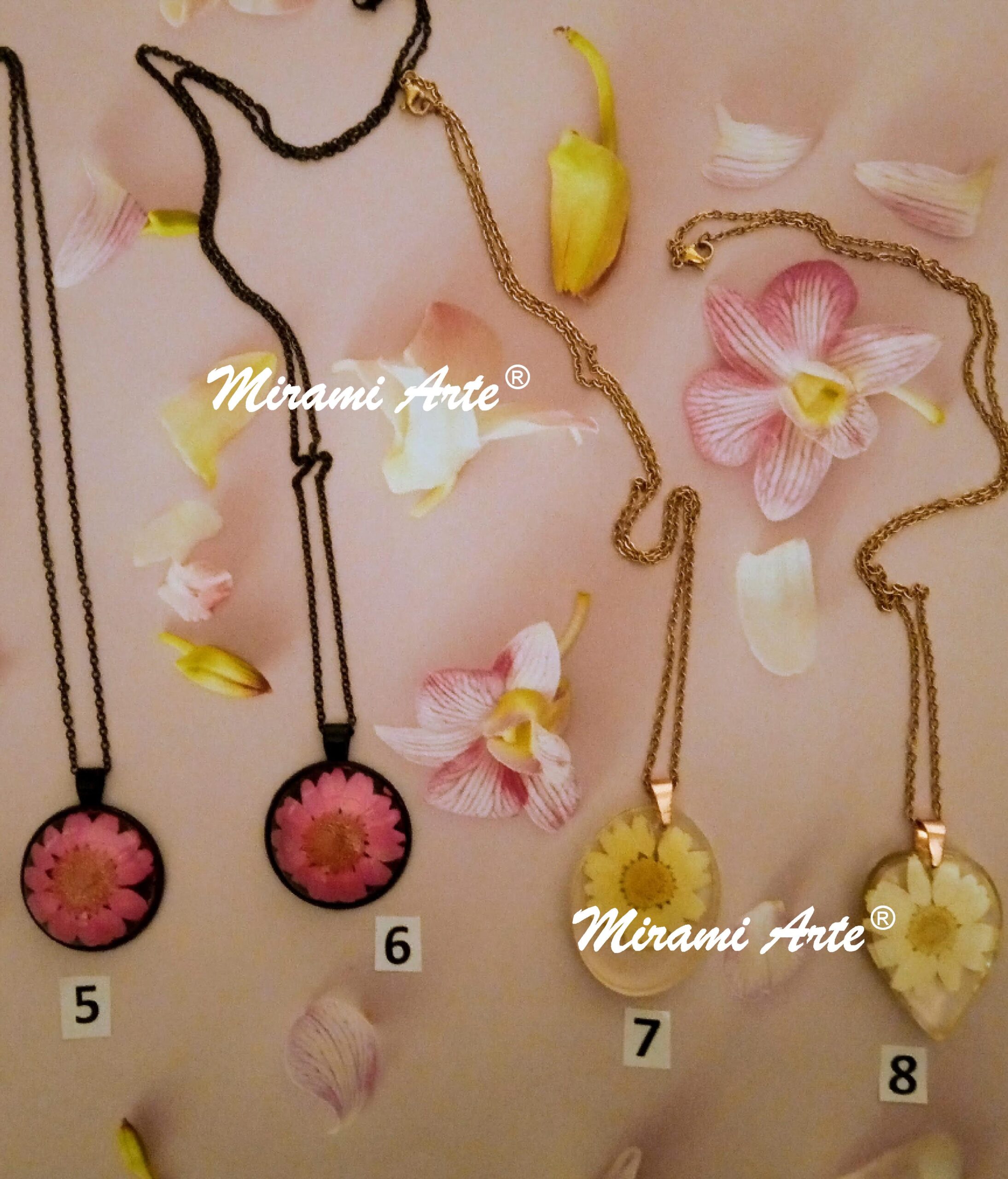 Colgantes en resina transparente en variadas formas rellena con flores naturales . Cadena dorada y/o plateada de 55 cms de largo.