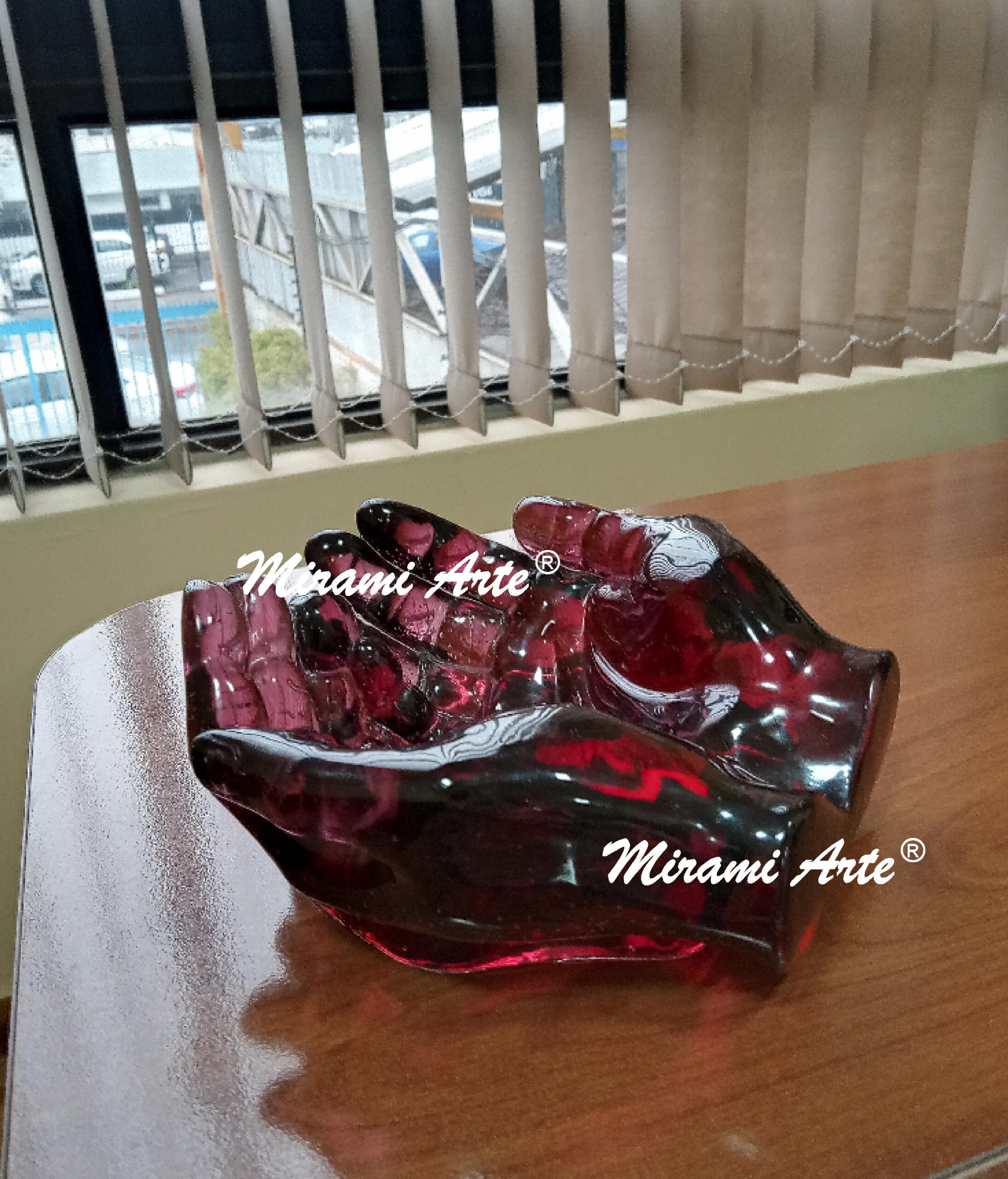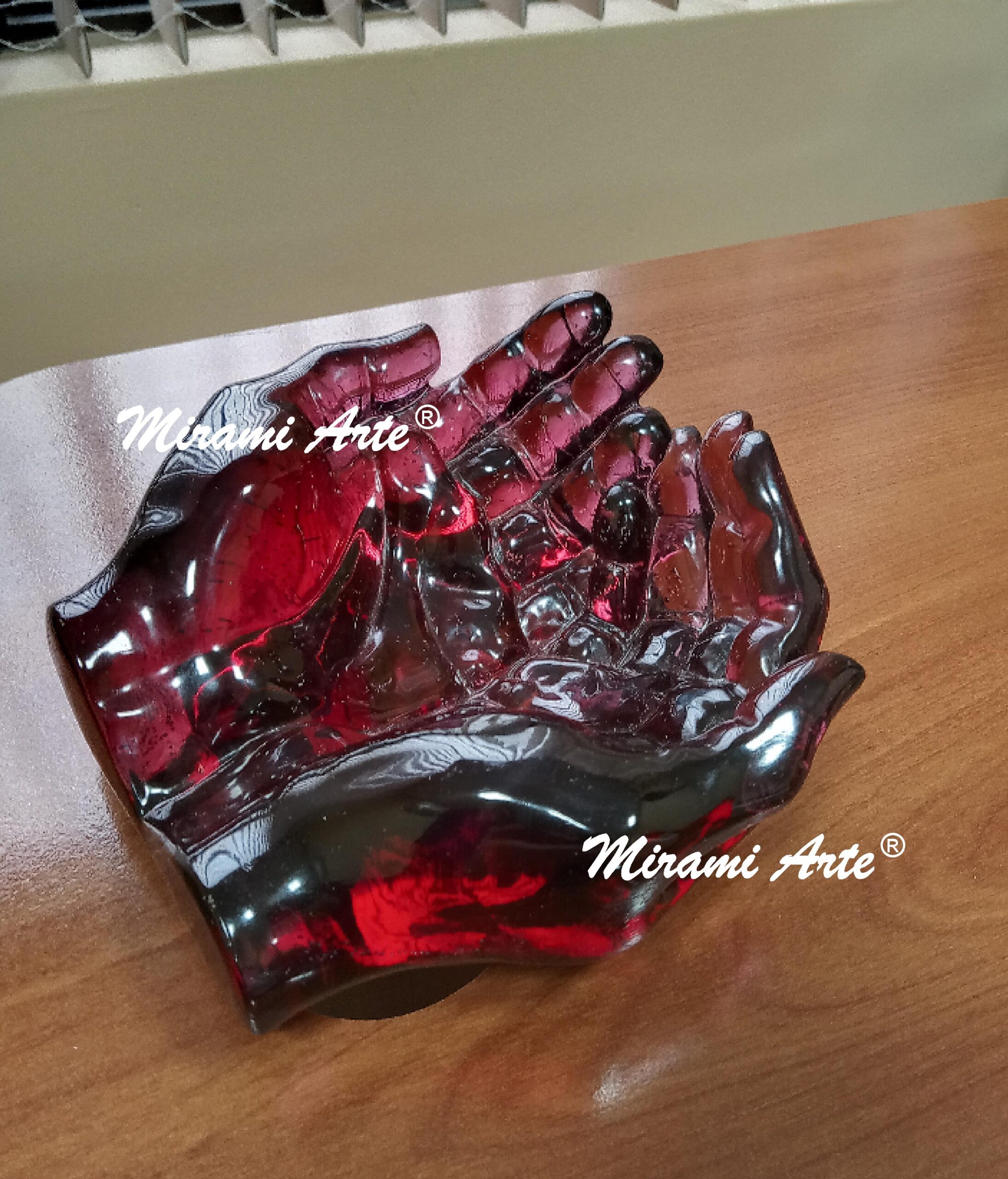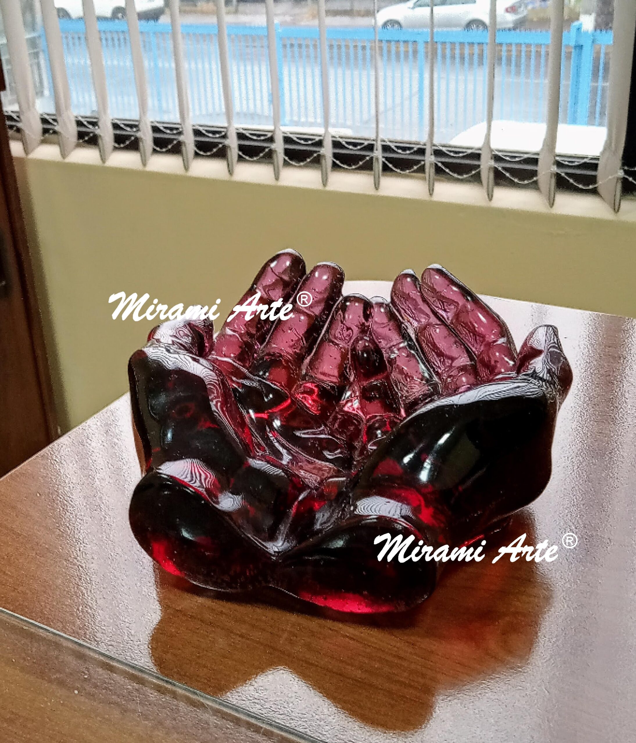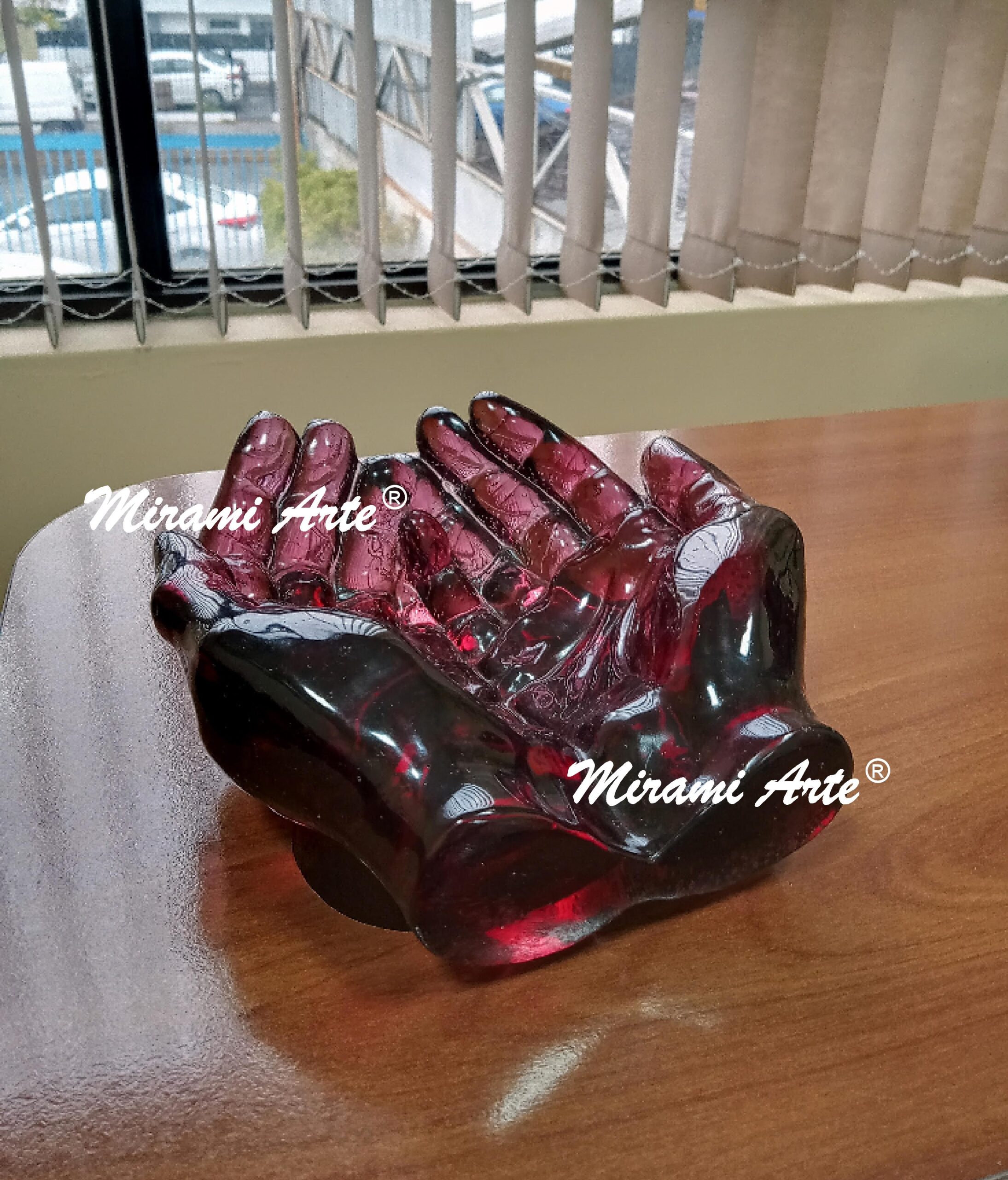Manos en resina color Burdeo semi transparente y que a contra luz desplegará bellos destellos.